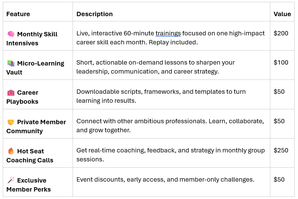 Live, interactive 60-minute trainings focused on one high-impact career skill each month. Replay library included so members can watch anytime.
